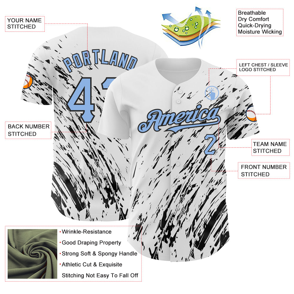 Custom White Light Blue-Black 3D Pattern Design Abstract Splash Authentic Baseball Jersey