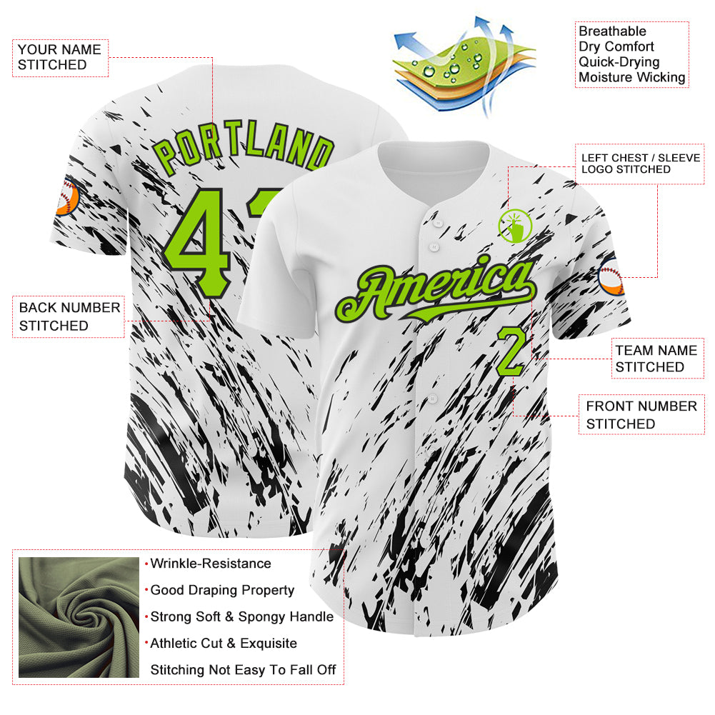 Custom White Neon Green-Black 3D Pattern Design Abstract Splash Authentic Baseball Jersey