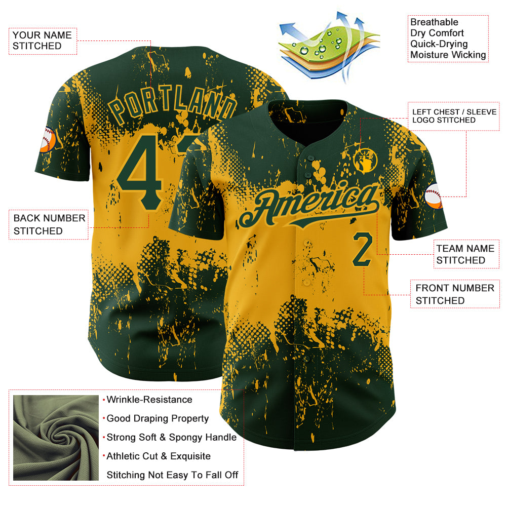 Custom Green Gold 3D Pattern Design Abstract Splatter Grunge Art Authentic Baseball Jersey