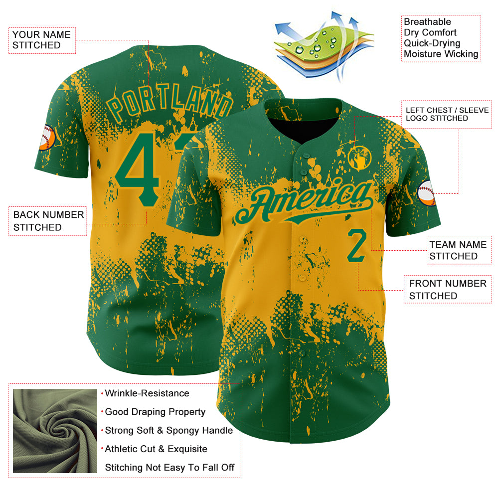 Custom Kelly Green Gold 3D Pattern Design Abstract Splatter Grunge Art Authentic Baseball Jersey