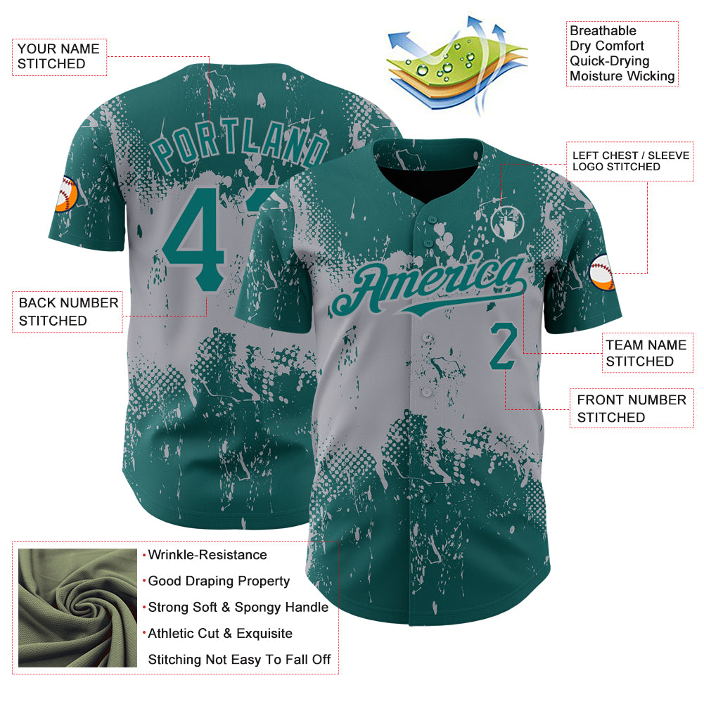 Custom Teal Gray 3D Pattern Design Abstract Splatter Grunge Art Authentic Baseball Jersey