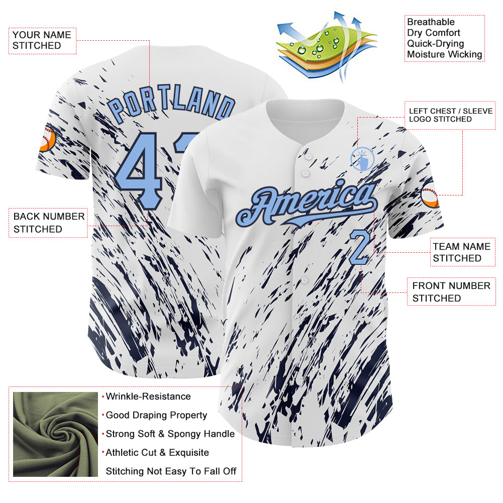 Custom White Light Blue-Navy 3D Pattern Design Abstract Splash Authentic Baseball Jersey