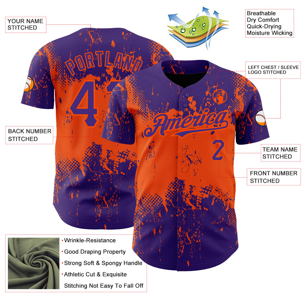Custom Purple Orange 3D Pattern Design Abstract Splatter Grunge Art Authentic Baseball Jersey