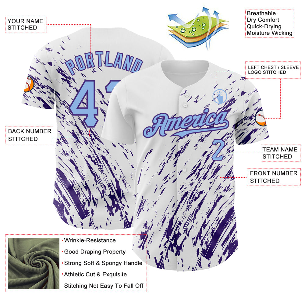 Custom White Light Blue-Purple 3D Pattern Design Abstract Splash Authentic Baseball Jersey