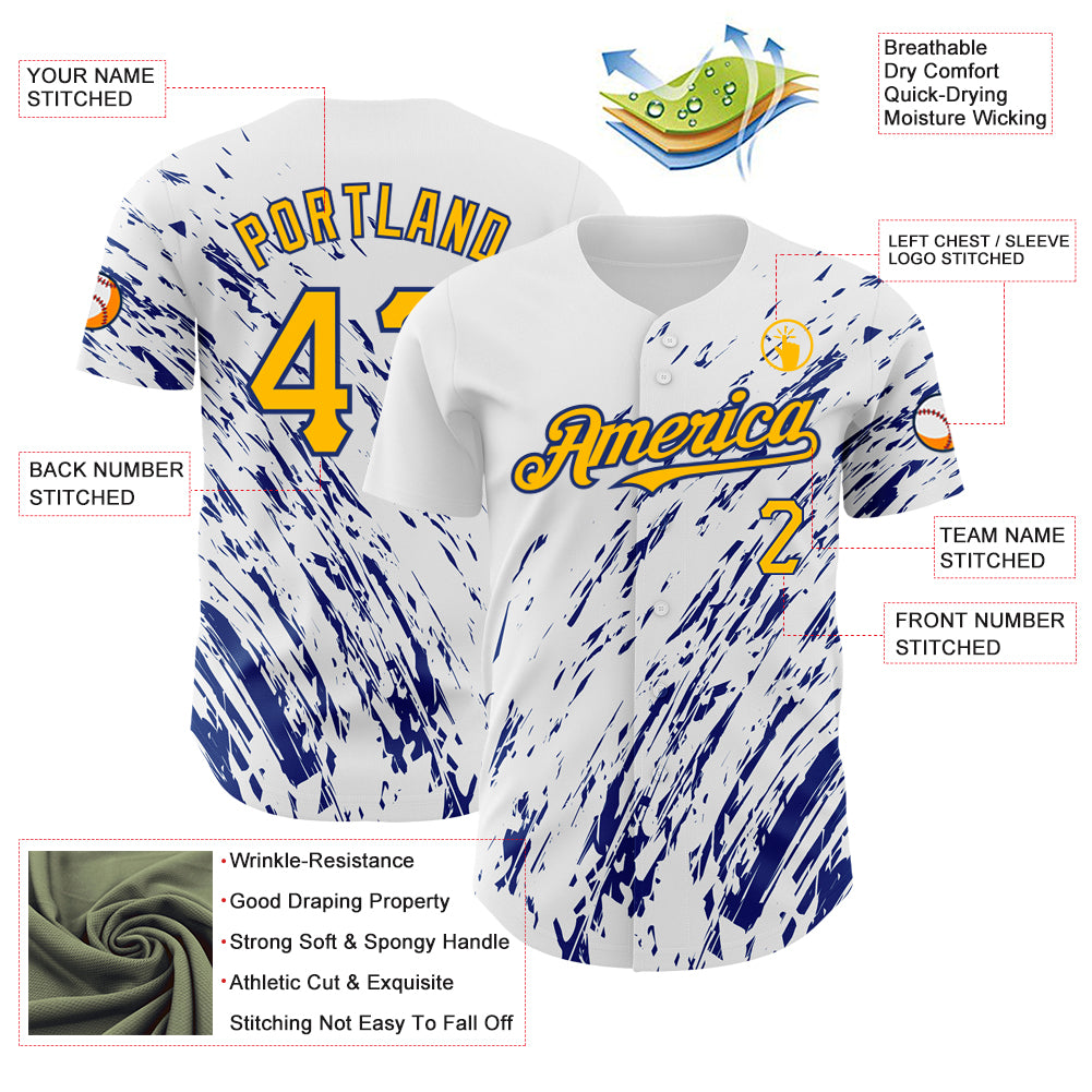 Custom White Gold-Royal 3D Pattern Design Abstract Splash Authentic Baseball Jersey
