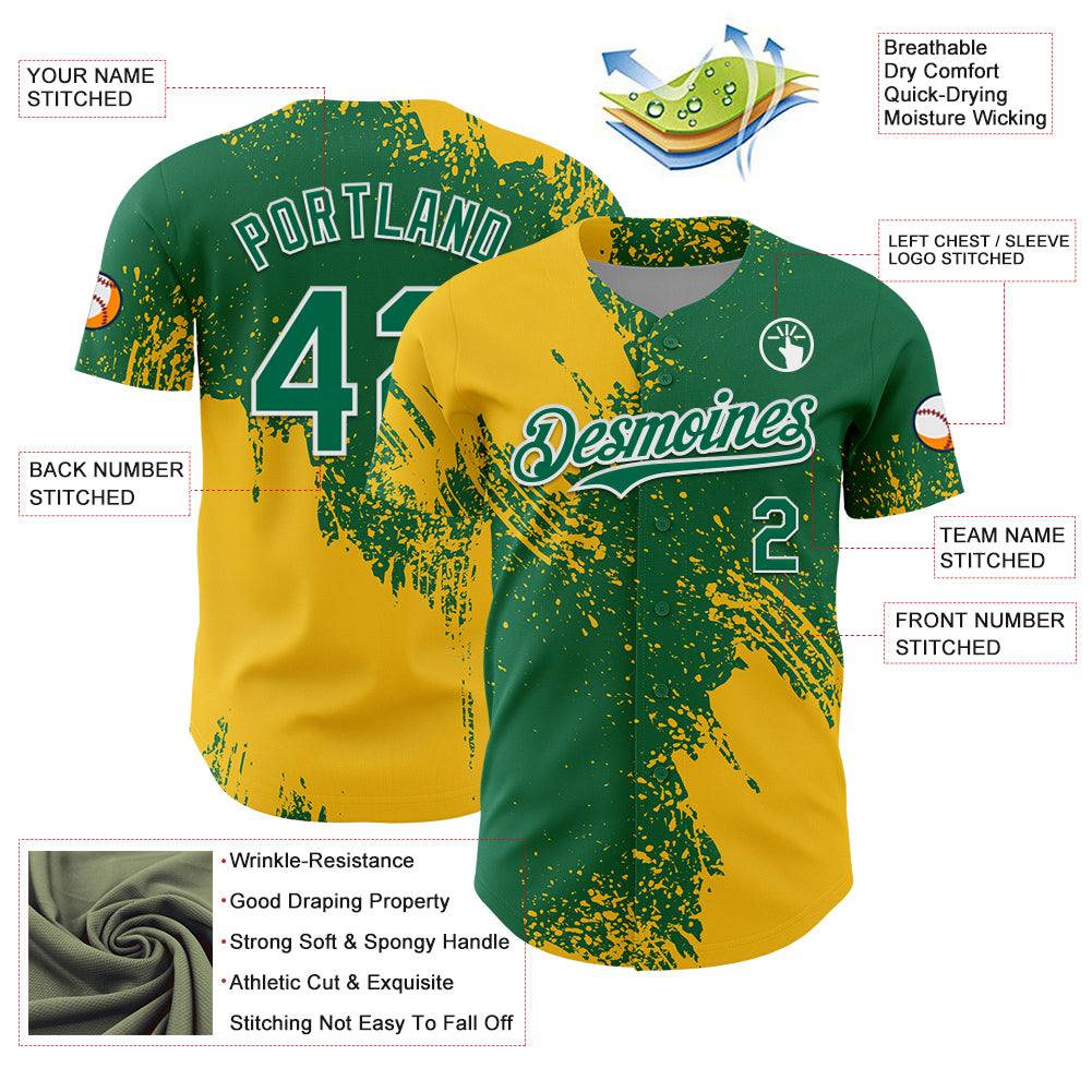Custom Yellow Kelly Green-White 3D Pattern Design Abstract Brush Stroke Authentic Baseball Jersey