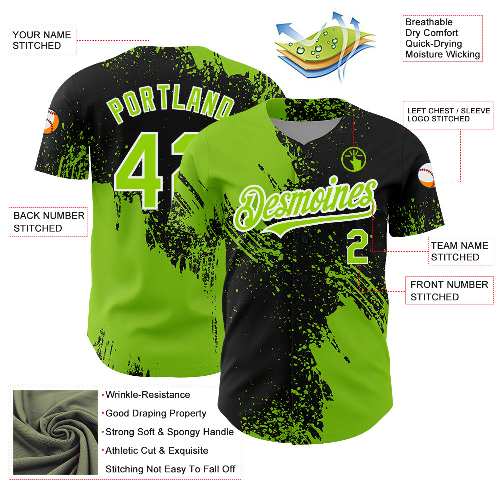 Custom Black Neon Green-White 3D Pattern Design Abstract Brush Stroke Authentic Baseball Jersey