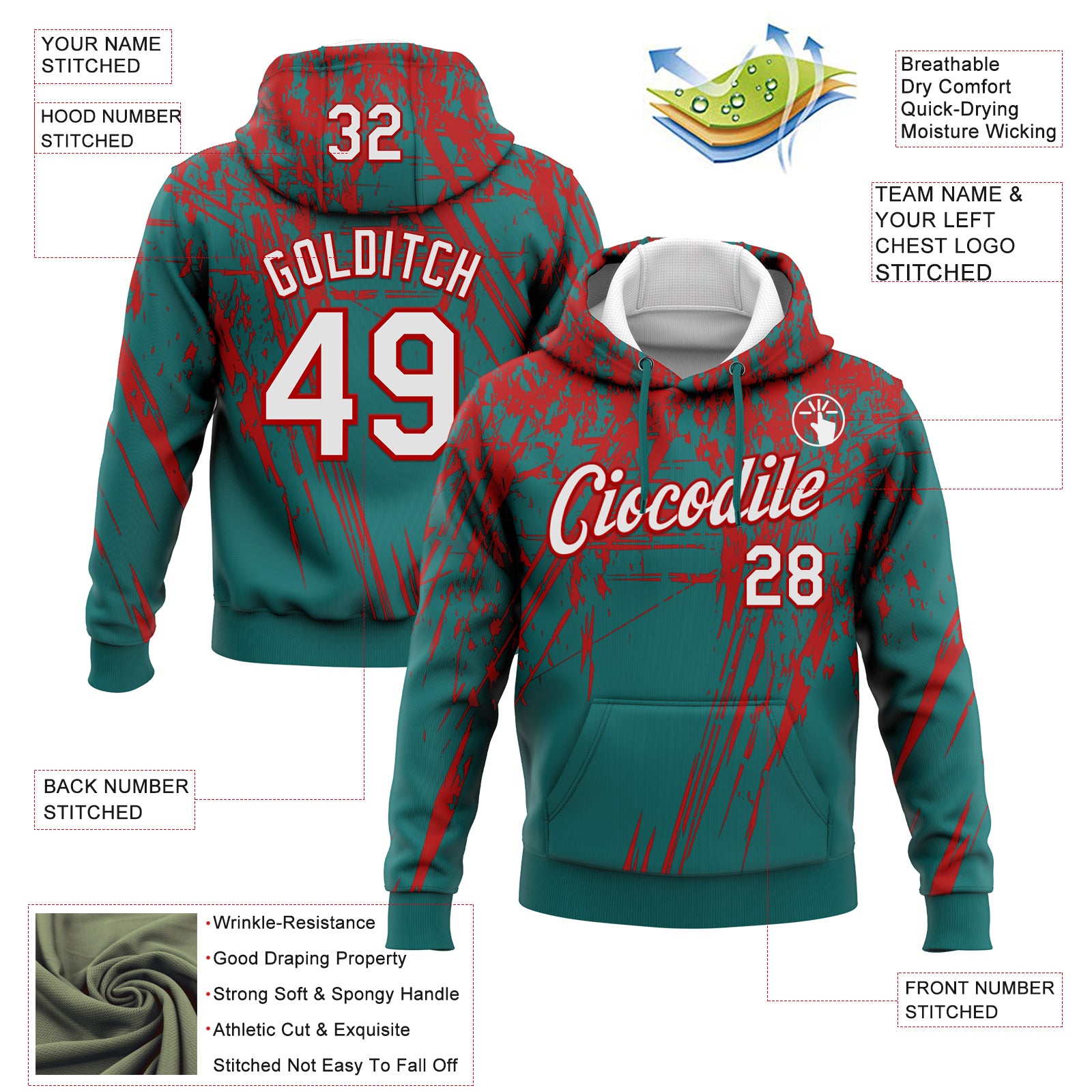 Custom Stitched Teal White-Red 3D Pattern Design Splash Grunge Art Sports Pullover Sweatshirt Hoodie