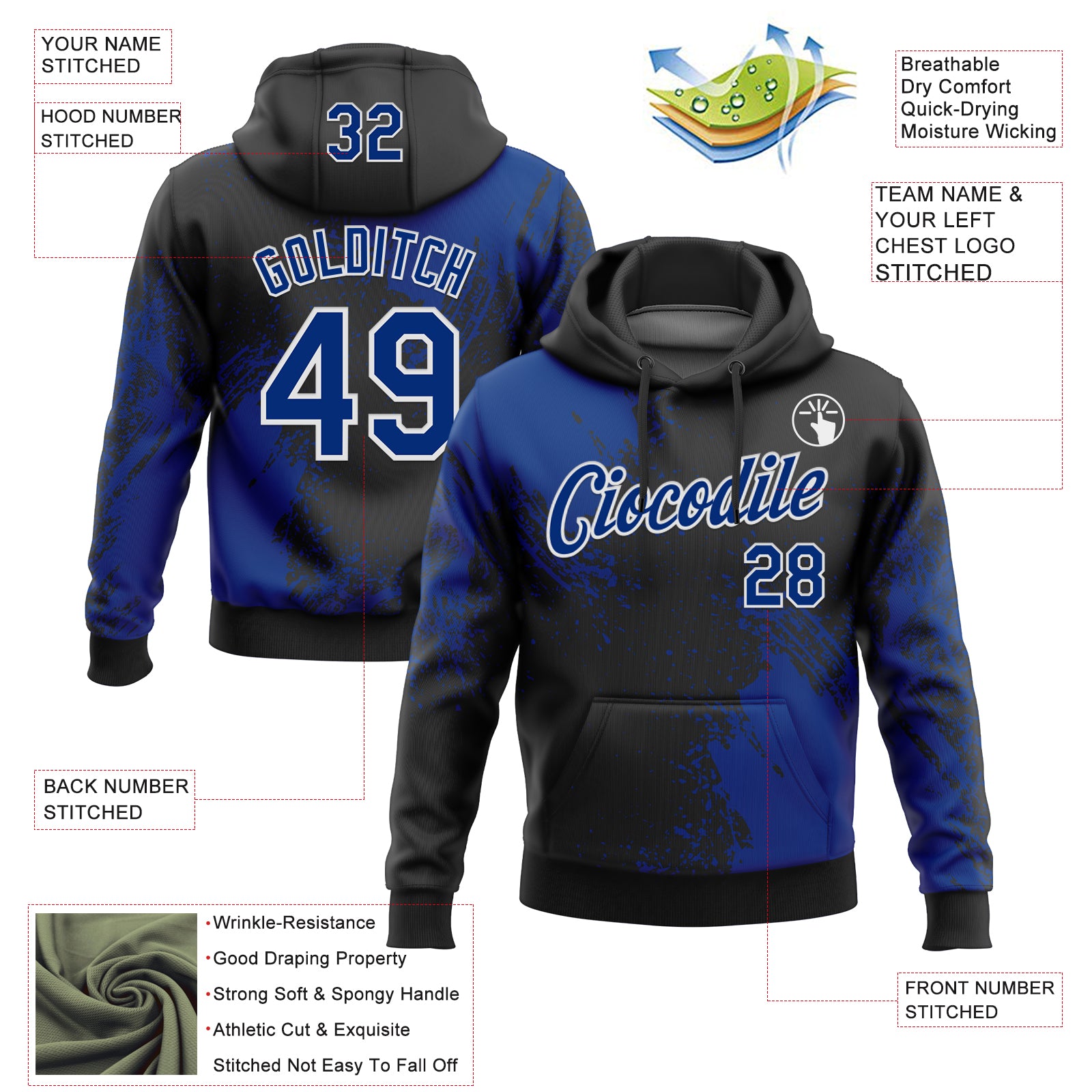 Custom Stitched Black Royal-White 3D Pattern Design Abstract Brush Stroke Sports Pullover Sweatshirt Hoodie
