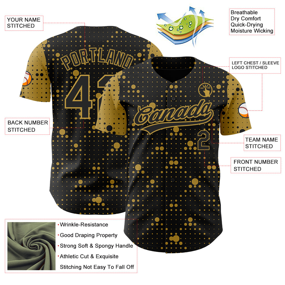 Custom Black Old Gold 3D Pattern Design Geometric Halftone Dots Authentic Baseball Jersey