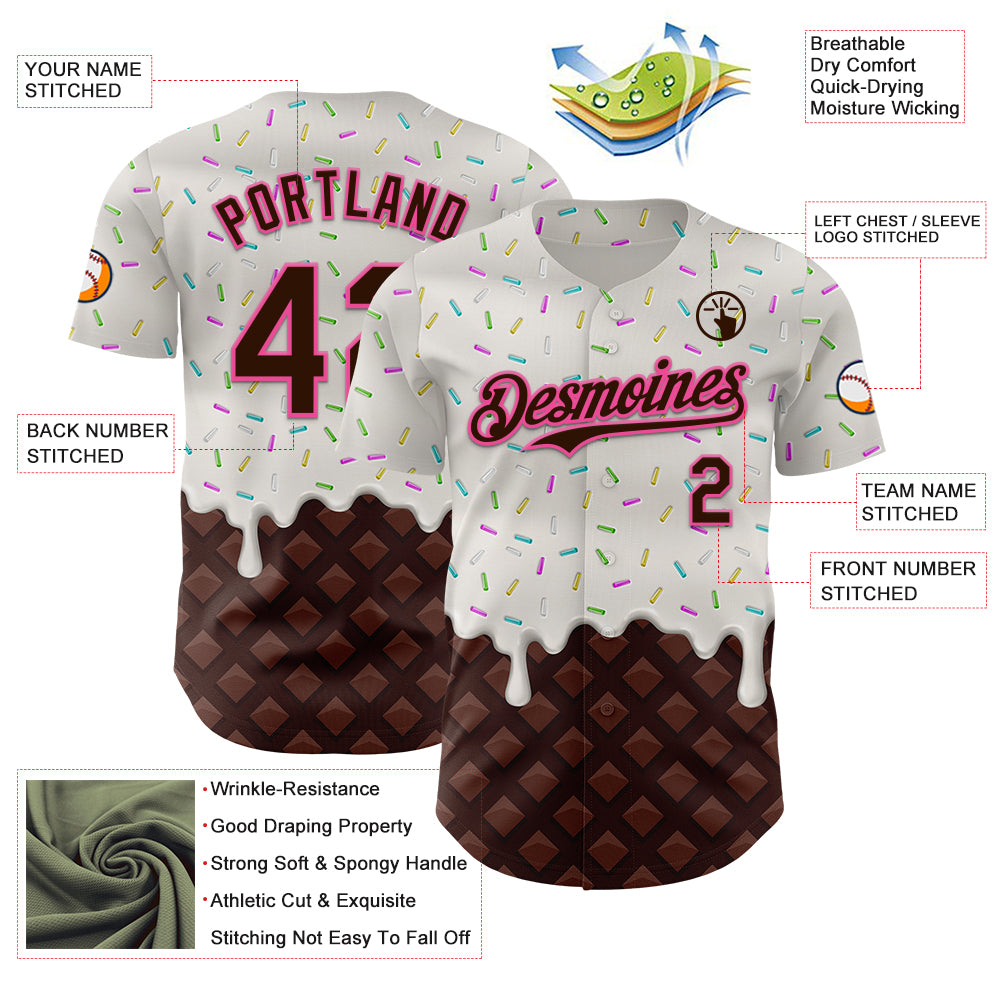 Custom White Brown-Pink 3D Pattern Design Foodie Dripping Ice Cream Authentic Baseball Jersey