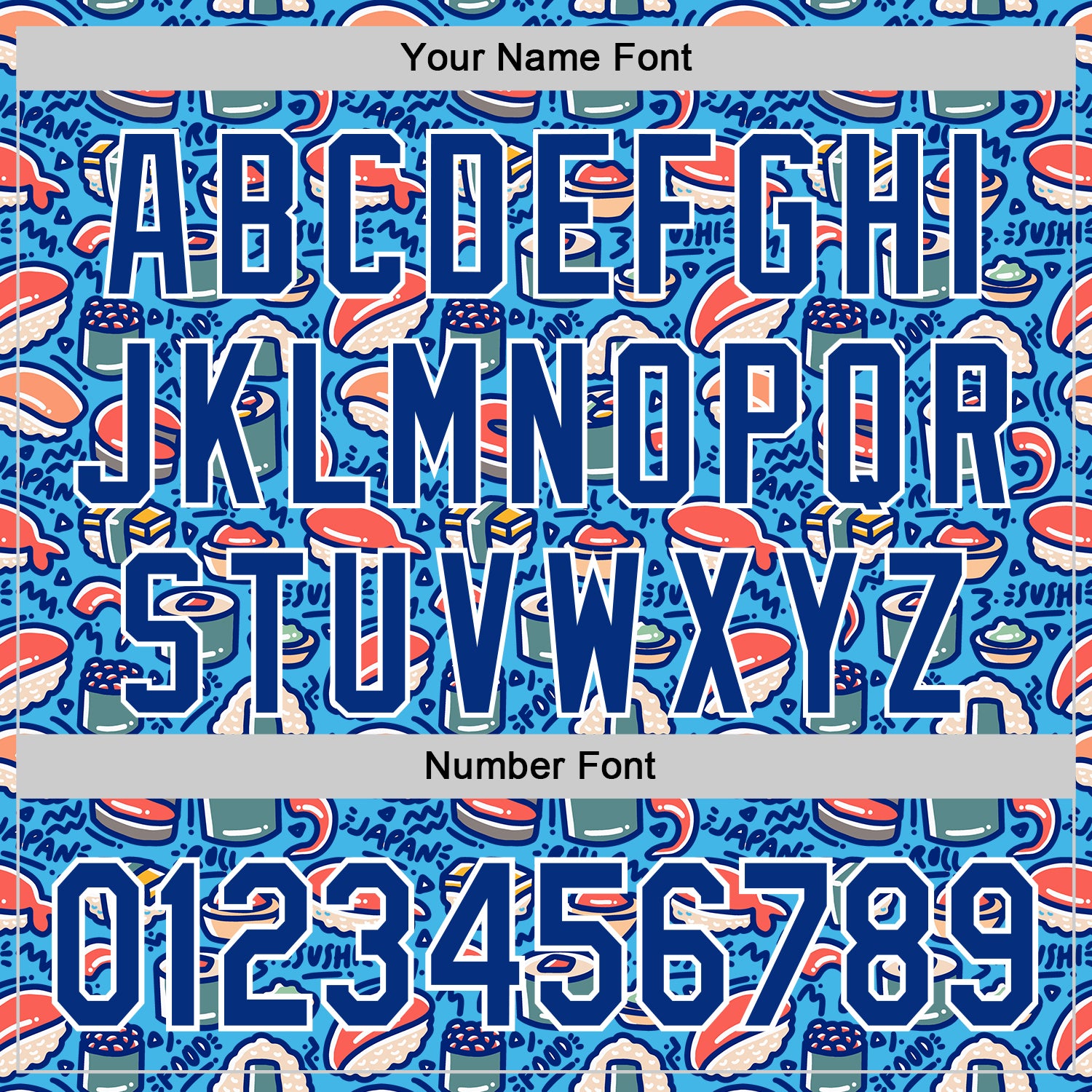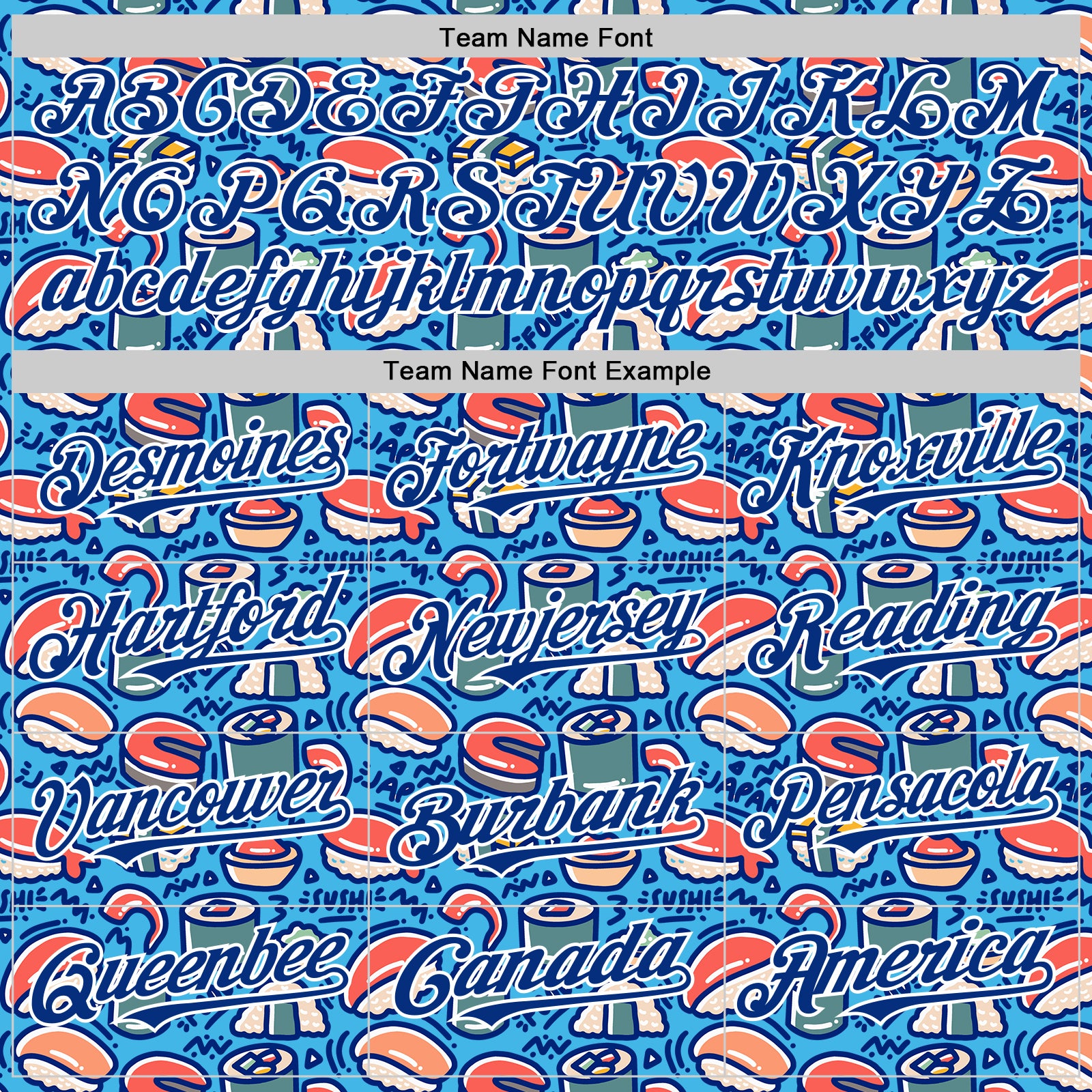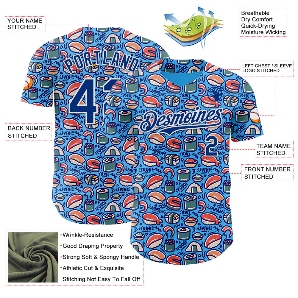 Custom Sky Blue Royal-White 3D Pattern Design Foodie Sushi Doodle Authentic Baseball Jersey