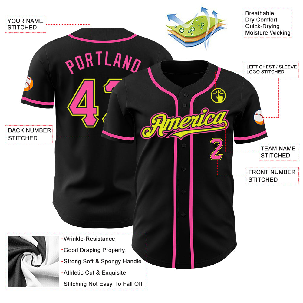Custom Black Pink-Neon Yellow Authentic Baseball Jersey
