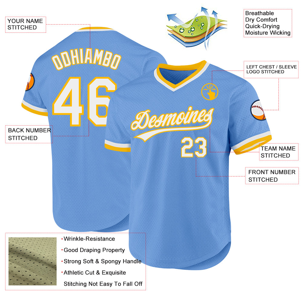 Custom Light Blue White-Gold Authentic Throwback Baseball Jersey