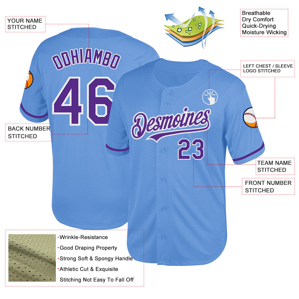 Custom Light Blue Purple-White Mesh Authentic Throwback Baseball Jersey