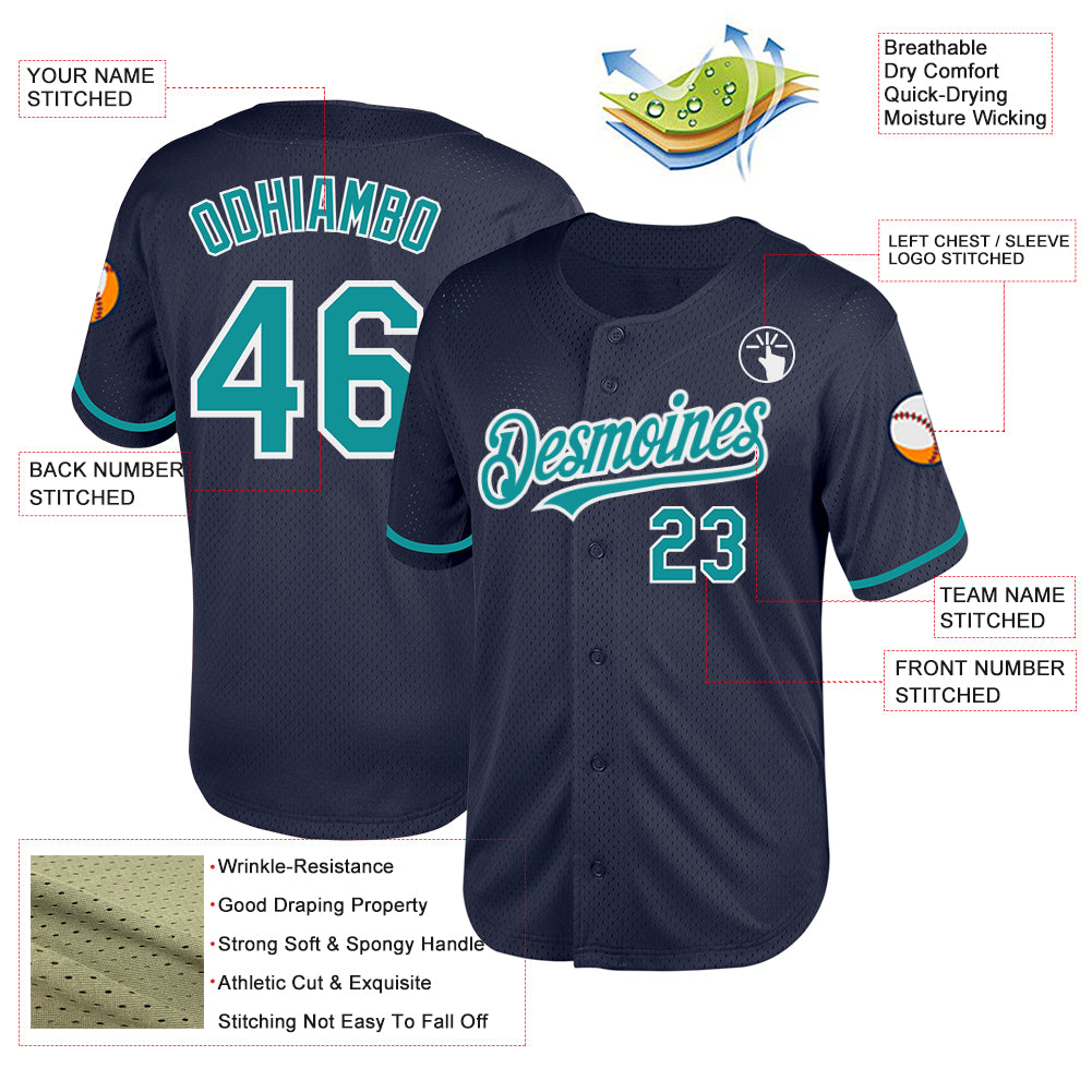 Custom Navy Teal-White Mesh Authentic Throwback Baseball Jersey
