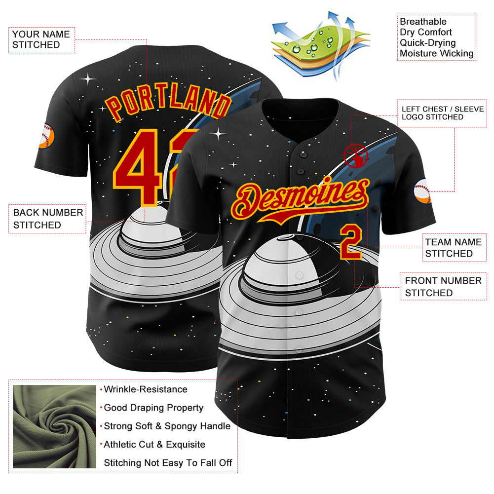 Custom Black Red-Gold 3D Pattern Design Alien UFO Saucer Authentic Baseball Jersey