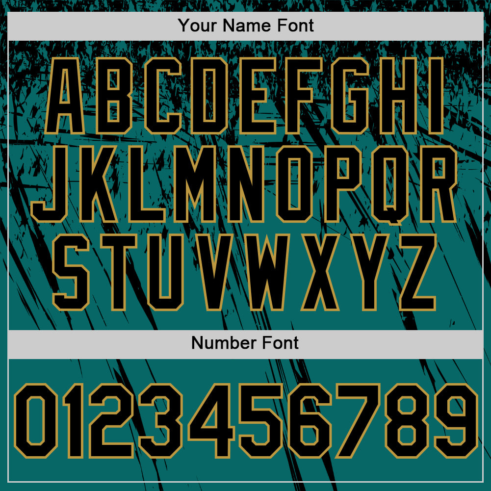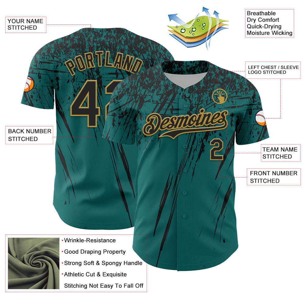 Custom Teal Black-Old Gold Distressed Scratch Brush Stroke Authentic Baseball Jersey