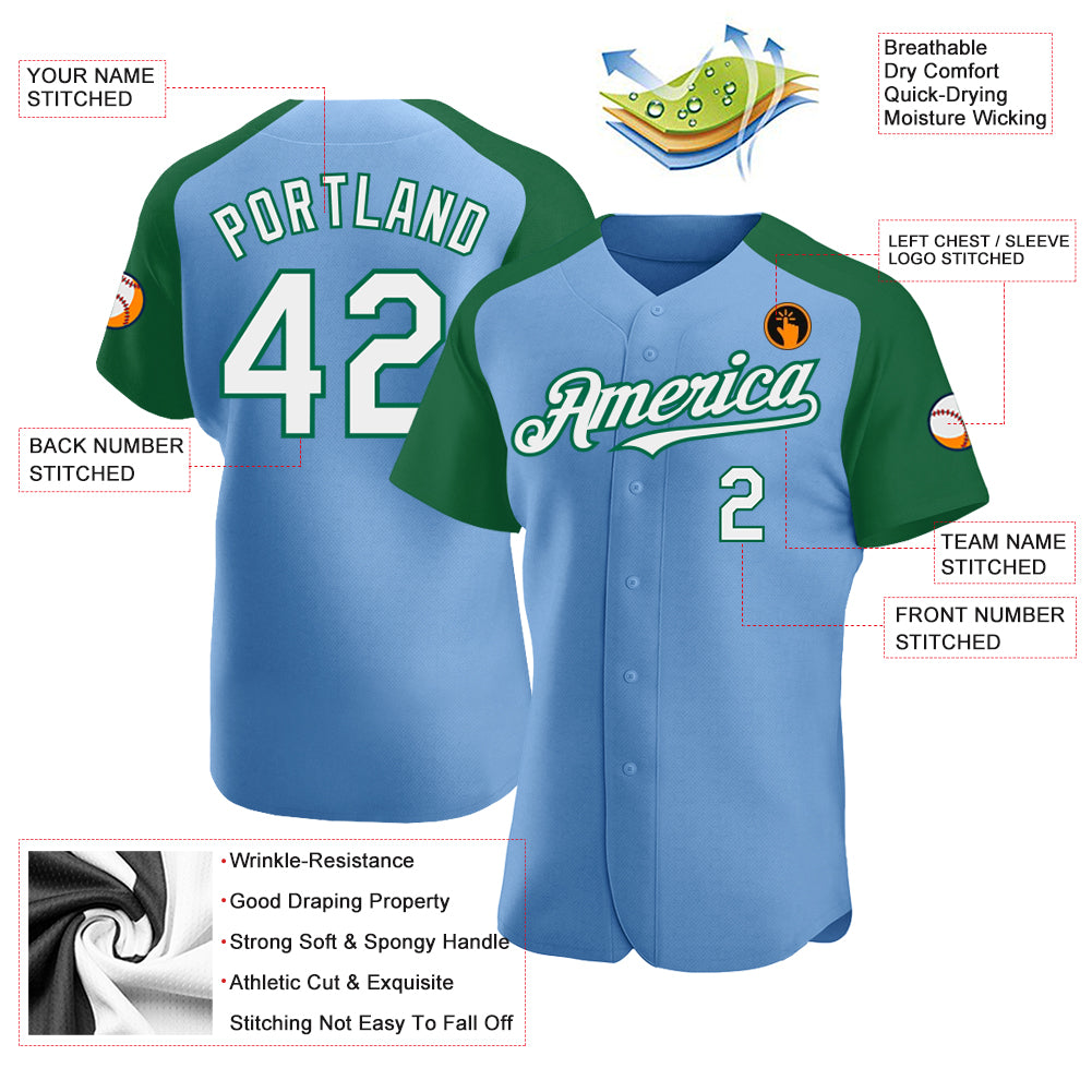Custom Light Blue White-Kelly Green Authentic Raglan Sleeves Baseball Jersey