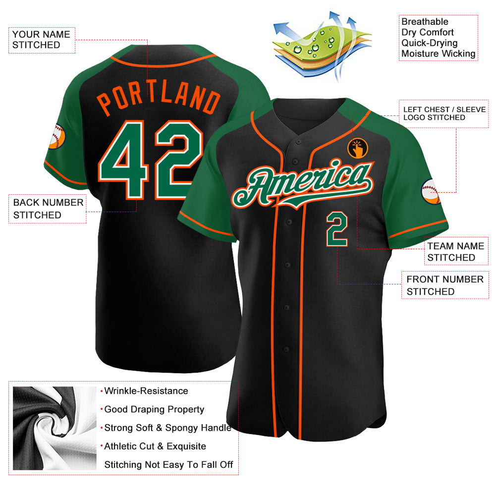 Custom Black Kelly Green-Orange Authentic Raglan Sleeves Baseball Jersey