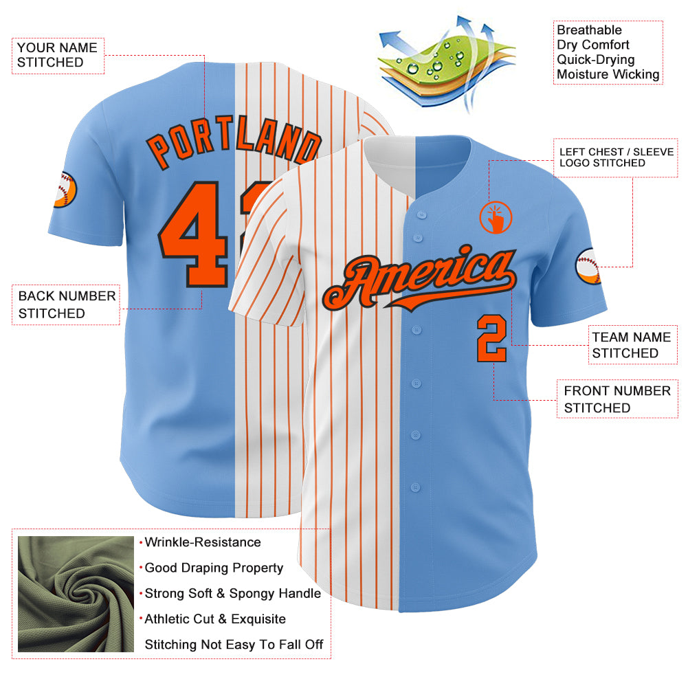 Custom Light Blue Black-Orange Pinstripe Authentic Split Fashion Baseball Jersey