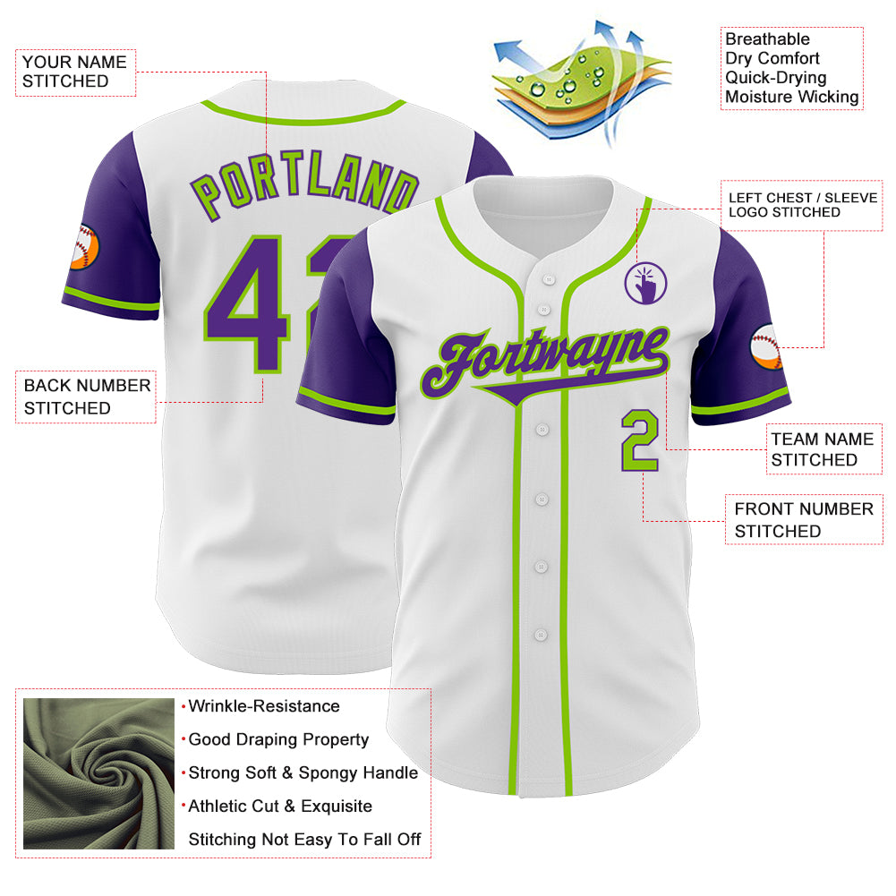 Custom White Purple-Neon Green Authentic Two Tone Baseball Jersey