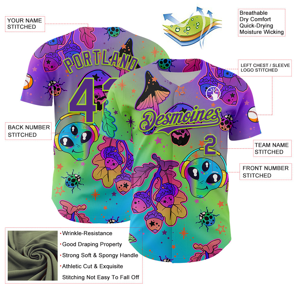 Custom Purple Neon Green 3D Pattern Design Trippy Magic Mushrooms Alien Authentic Baseball Jersey