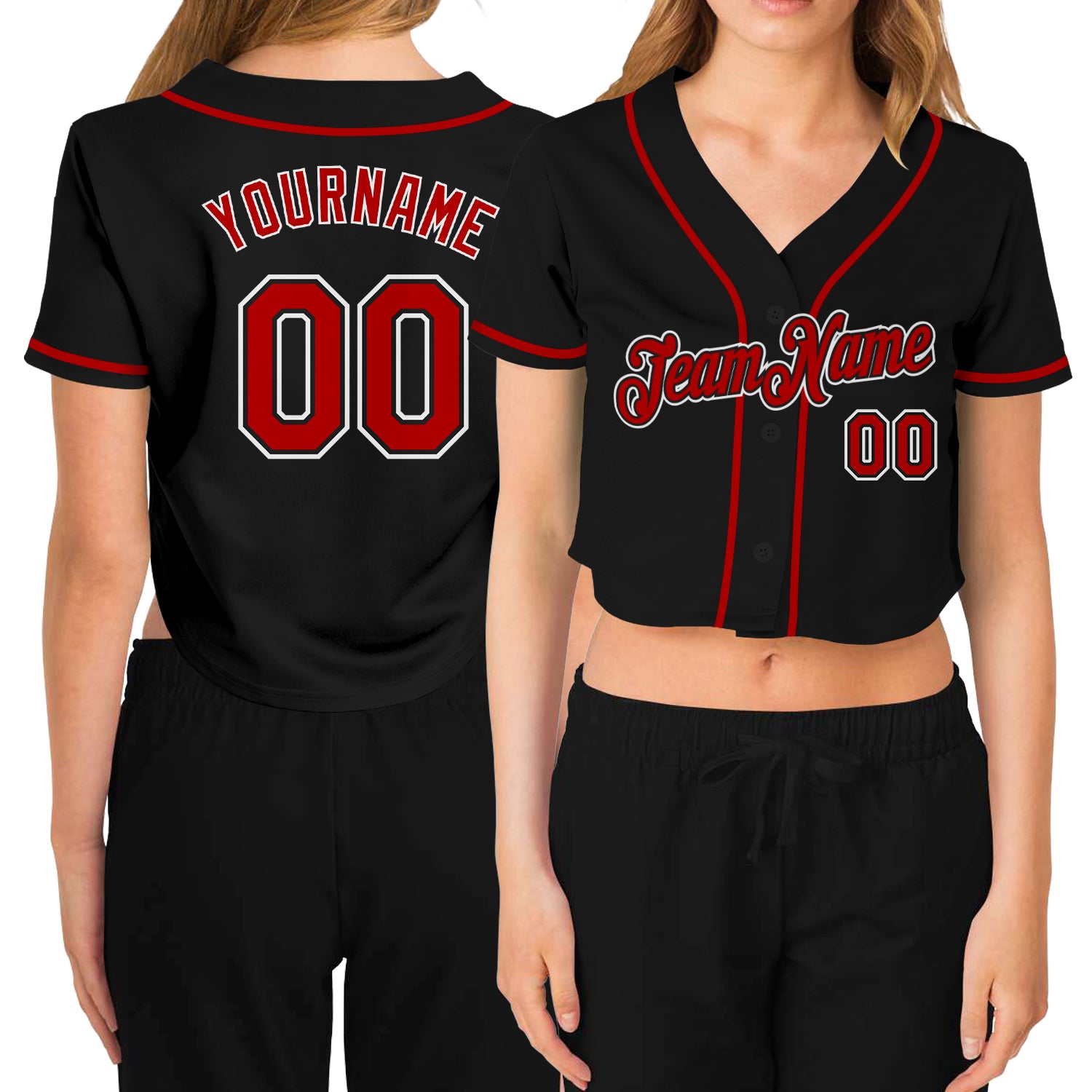 Custom Women's Black Red-White V-Neck Cropped Baseball Jersey