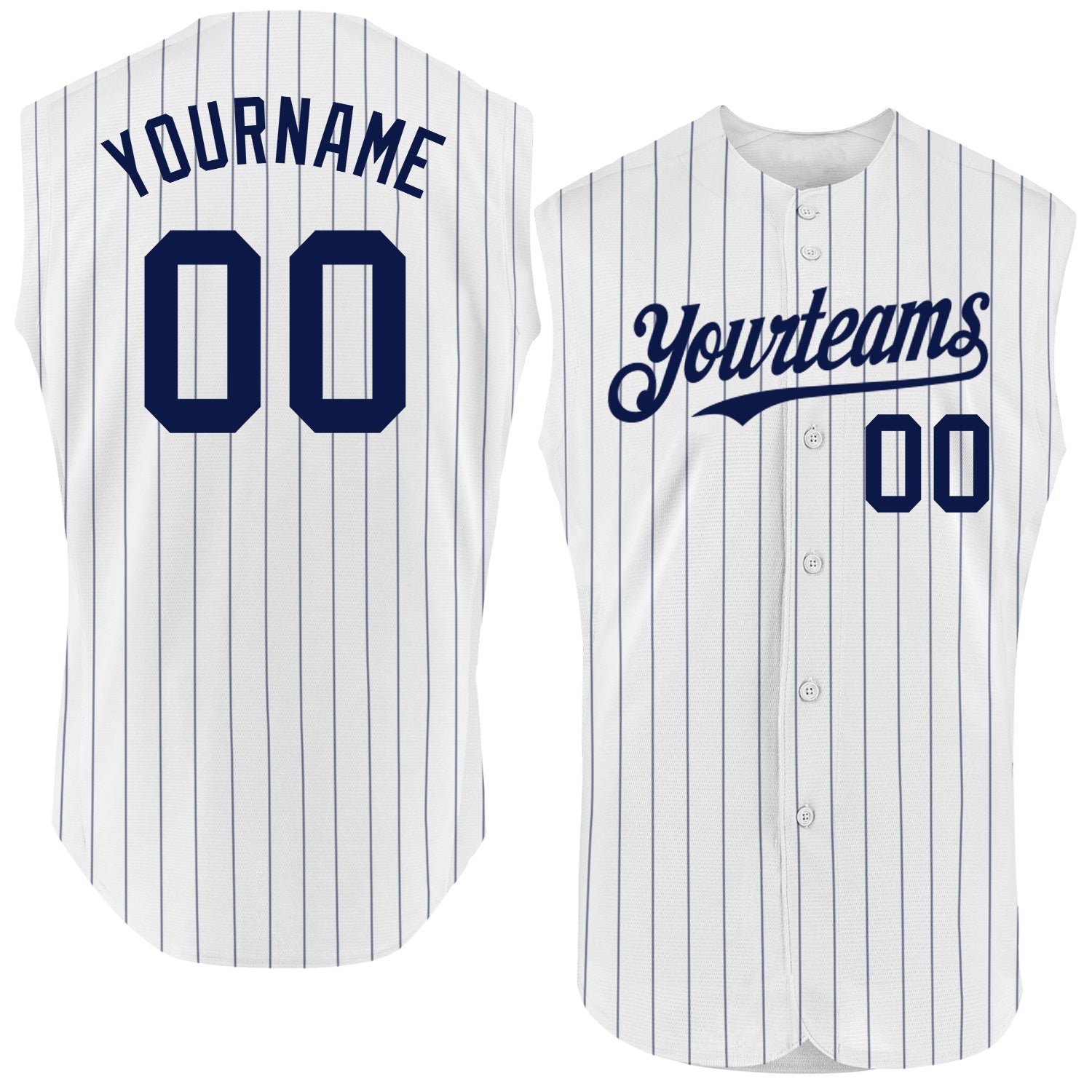 Custom White Navy Pinstripe Navy Authentic Sleeveless Baseball Jersey
