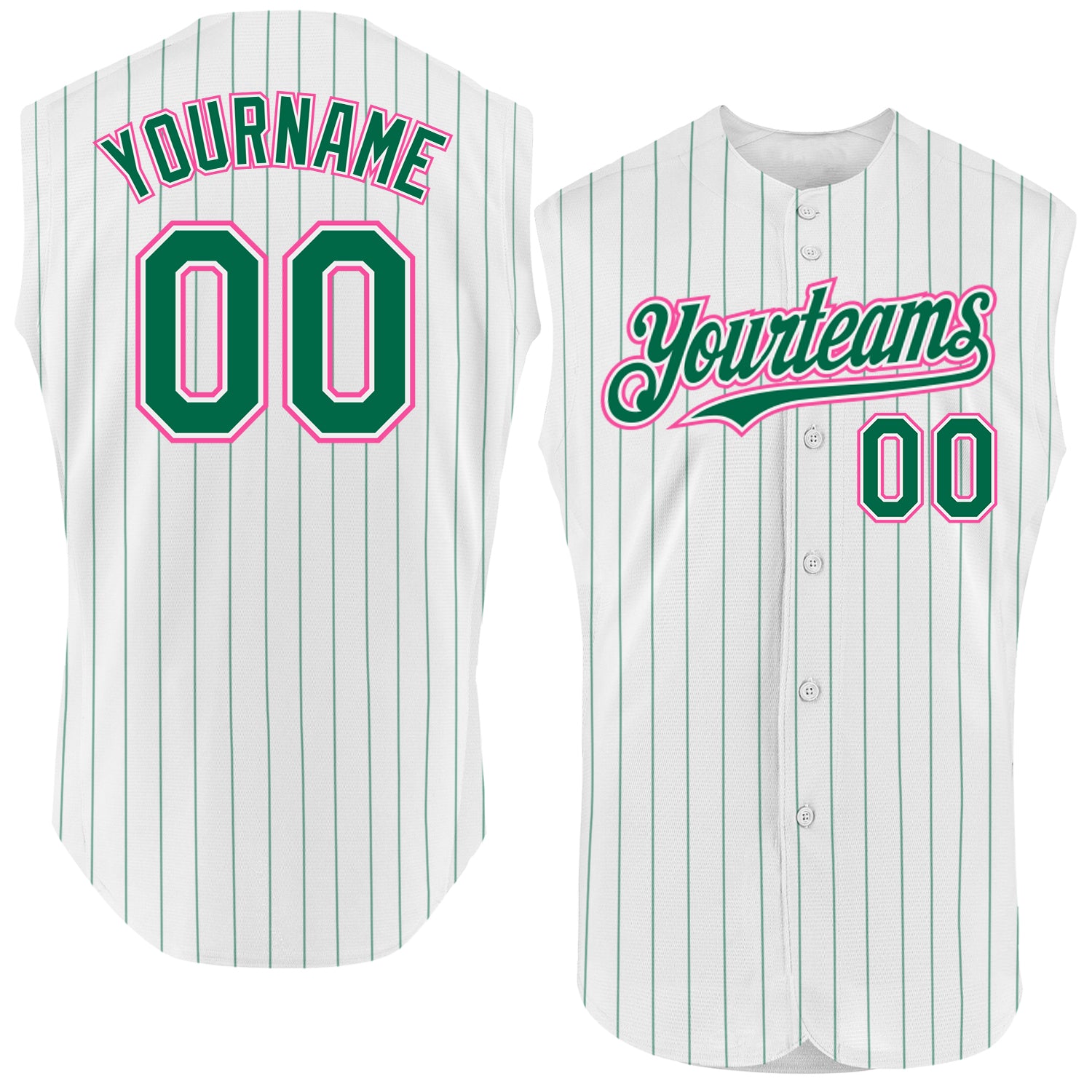 Custom White Kelly Green Pinstripe Pink Authentic Sleeveless Baseball Jersey