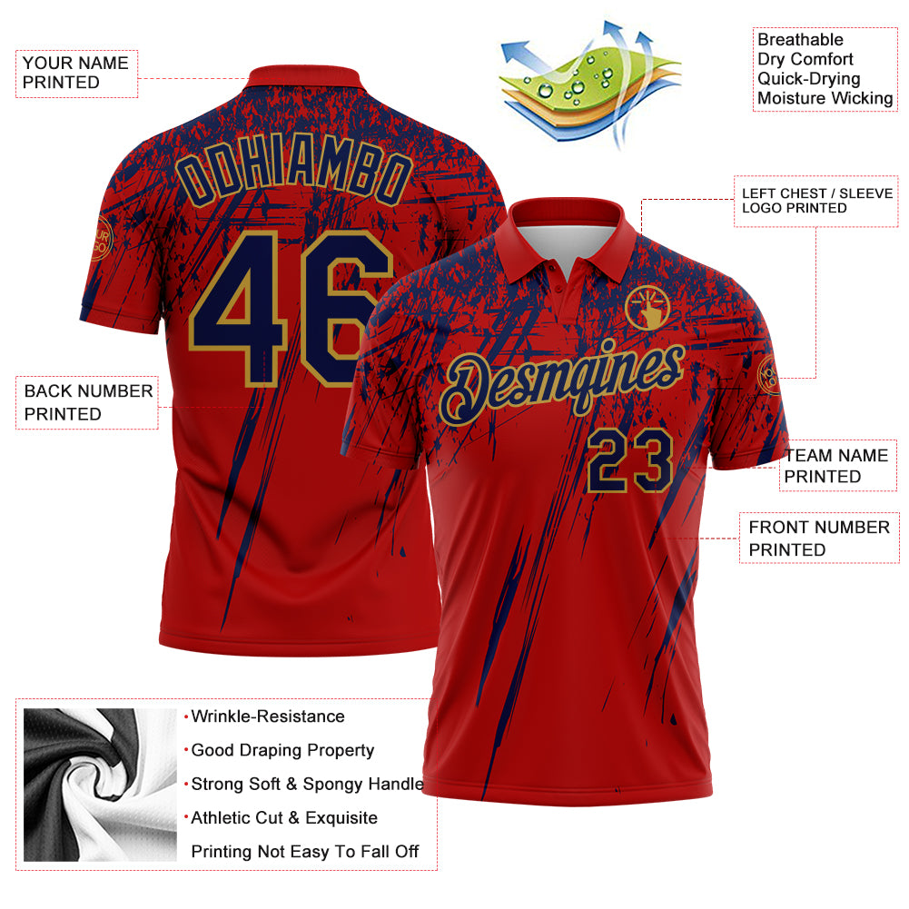 Custom Red Navy-Old Gold Distressed Scratch Brush Stroke Performance Polo Shirt