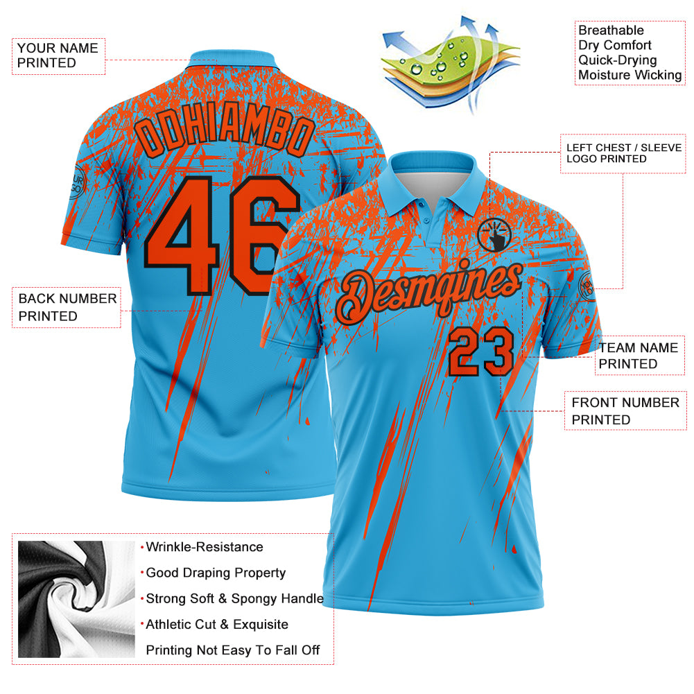 Custom Sky Blue Orange-Black Distressed Scratch Brush Stroke Performance Polo Shirt