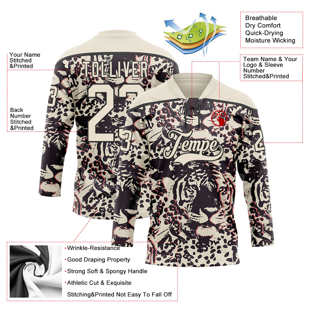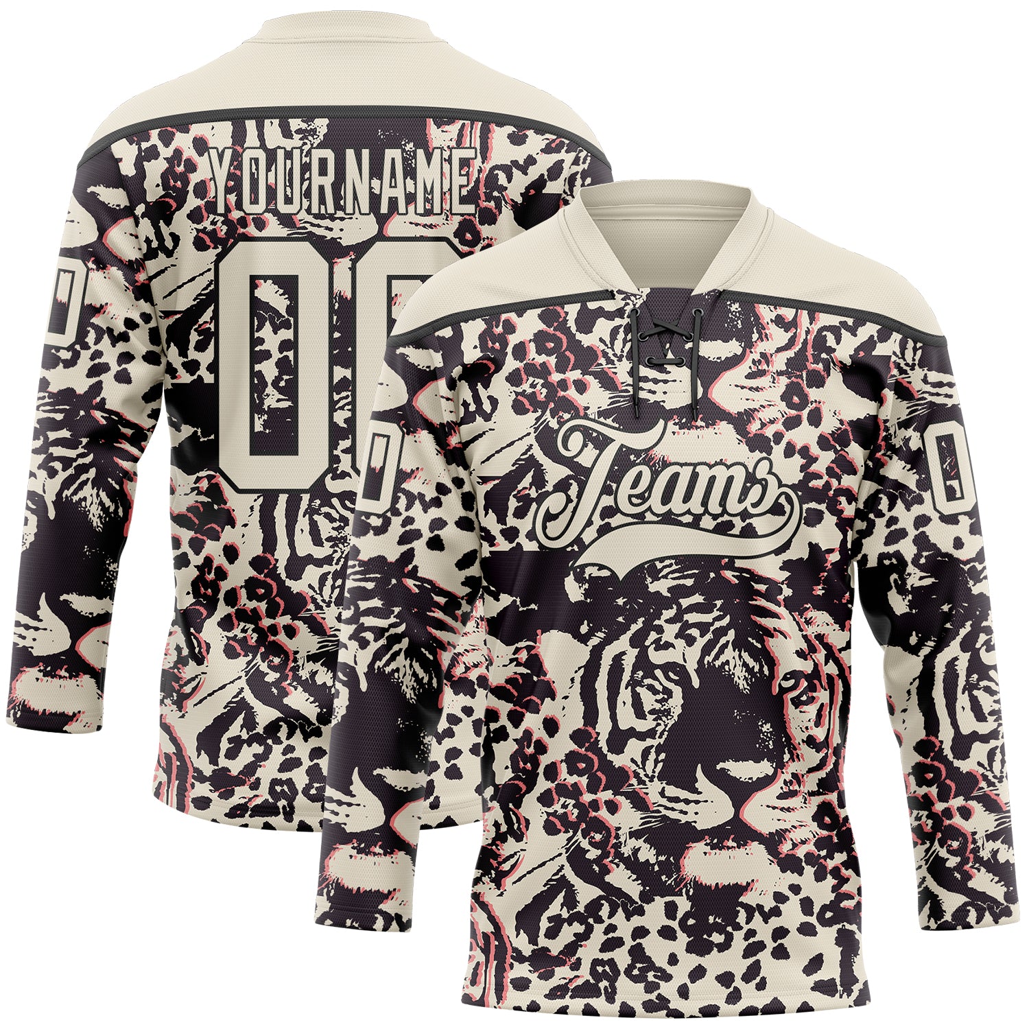 Custom Cream Black-Pink 3D Pattern Tiger Print Hockey Lace Neck Jersey