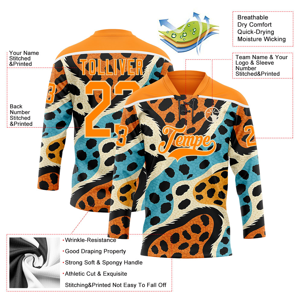 Custom Bay Orange Blue Black-Cream 3D Pattern Animal Print Hockey Lace Neck Jersey