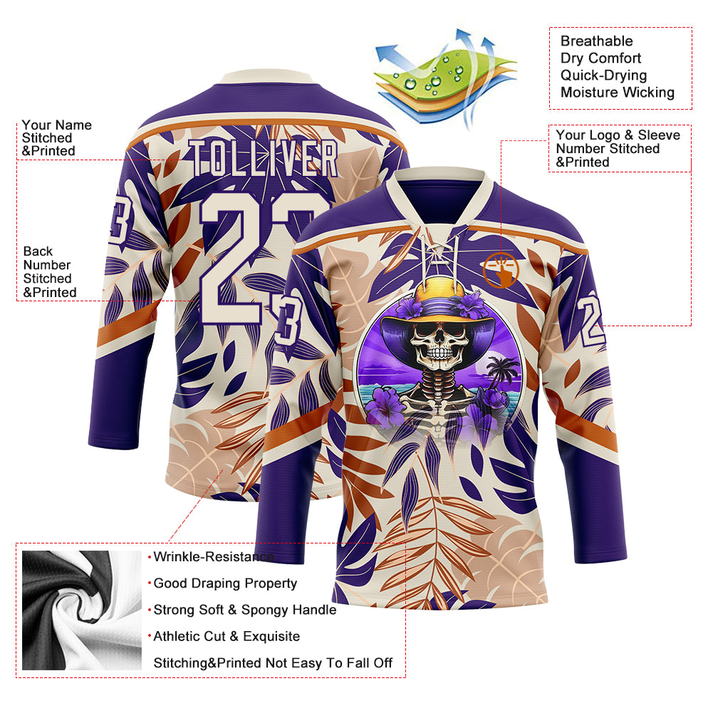 Custom Purple Cream-Texas Orange 3D Pattern Hawaii Tropical Palm Trees Hockey Lace Neck Jersey
