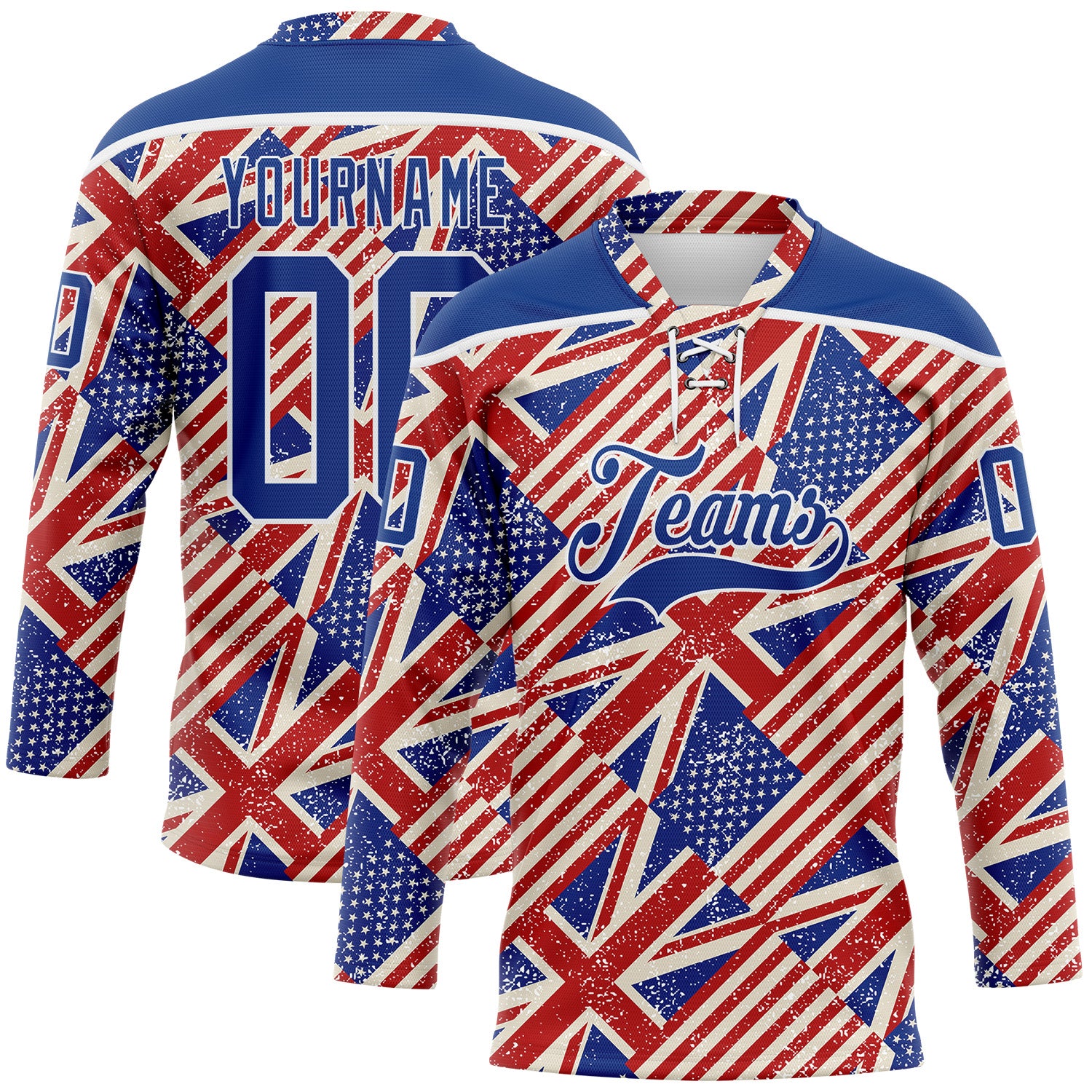 Custom Royal Red Cream-White American Flag Grunge Hockey Lace Neck Jersey