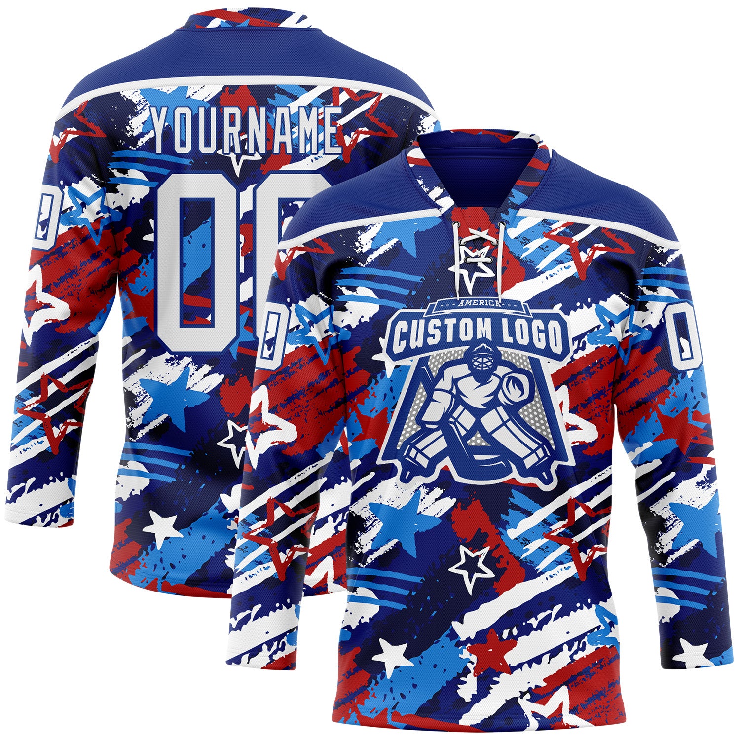 Custom Royal White-Red American Flag Hockey Lace Neck Jersey