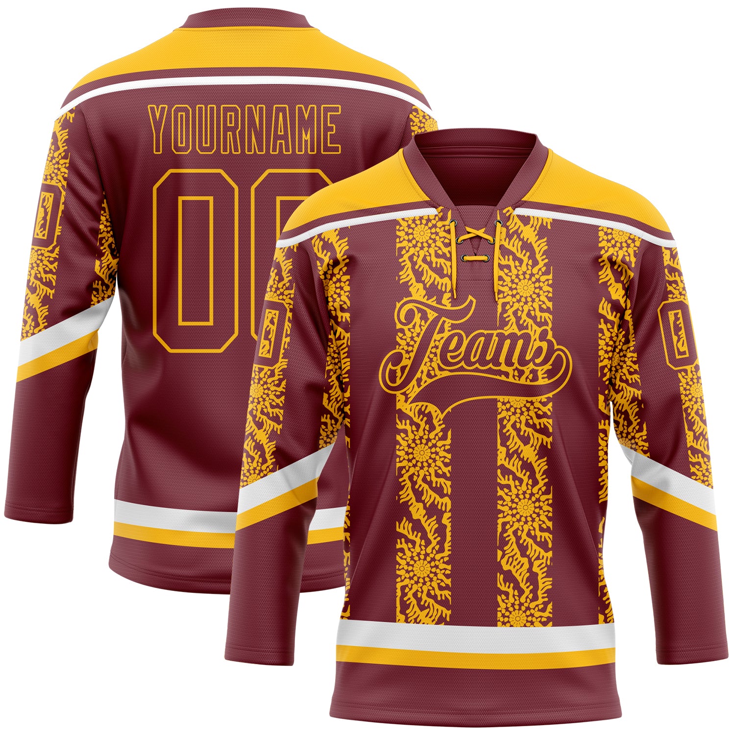 Custom Burgundy Gold-White 3D Pattern Abstract Shape Hockey Lace Neck Jersey