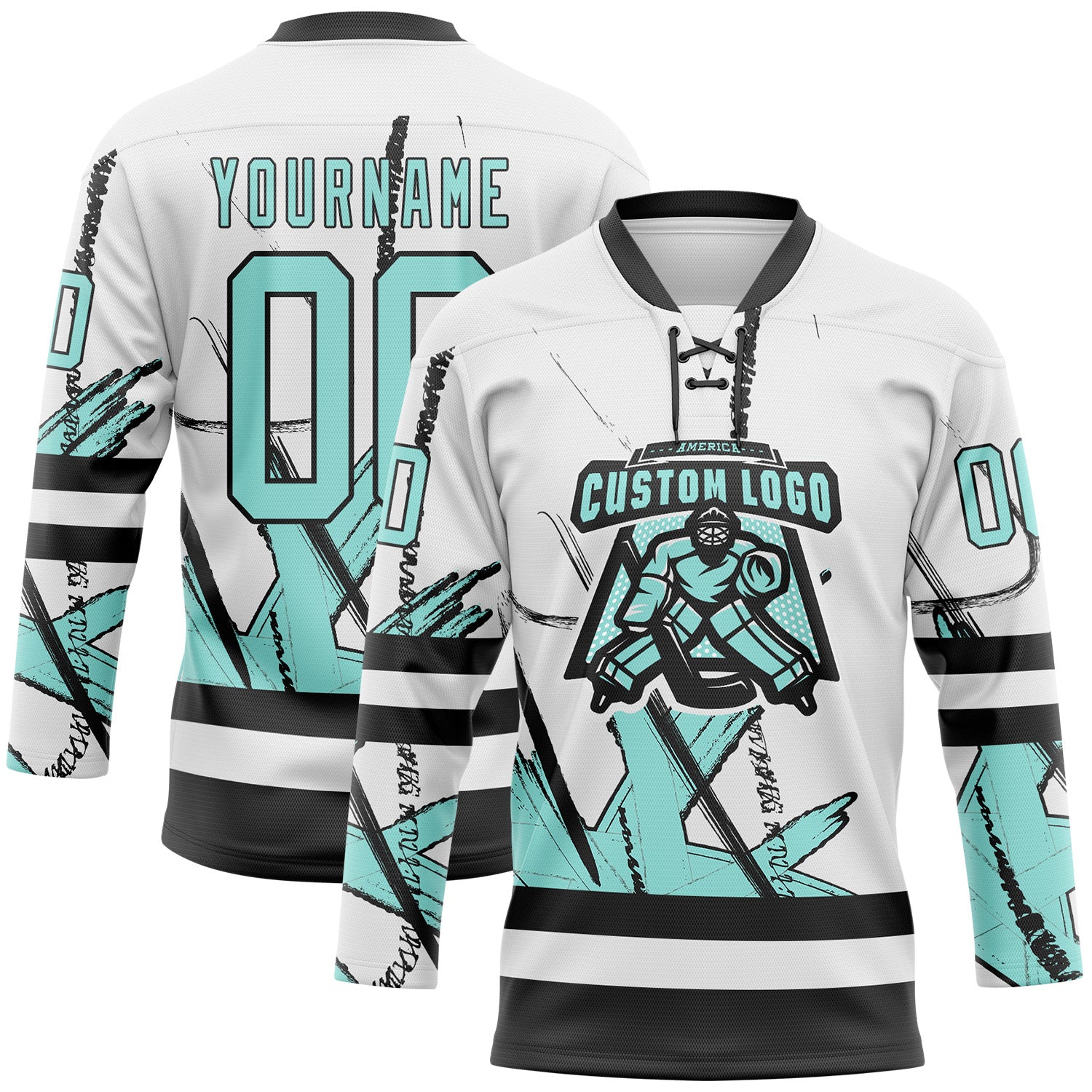 Custom White Ice Blue-Black 3D Pattern Abstract Splatter Paint Hockey Lace Neck Jersey