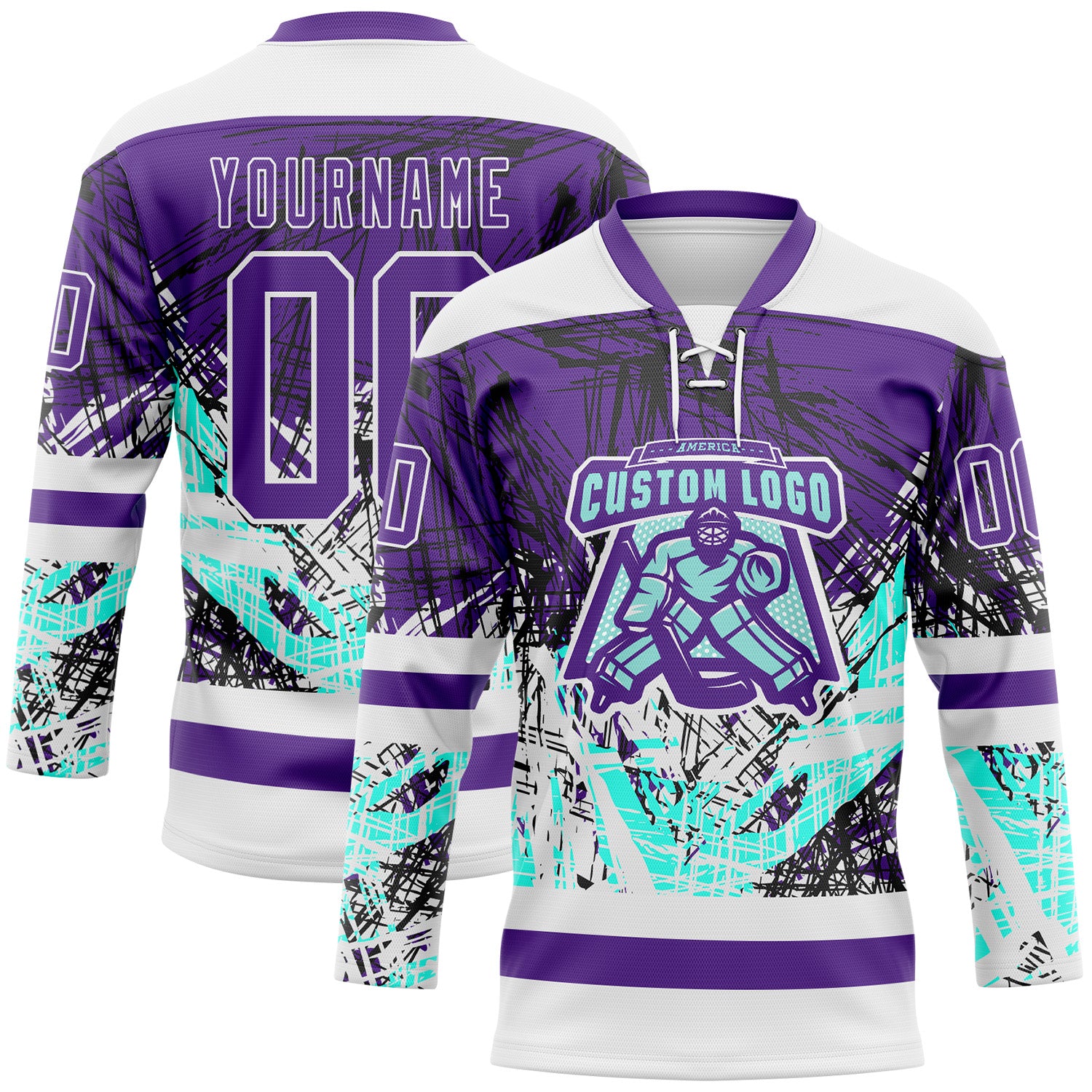 Custom Purple Green-White 3D Pattern Abstract Splatter Paint Grunge Hockey Lace Neck Jersey