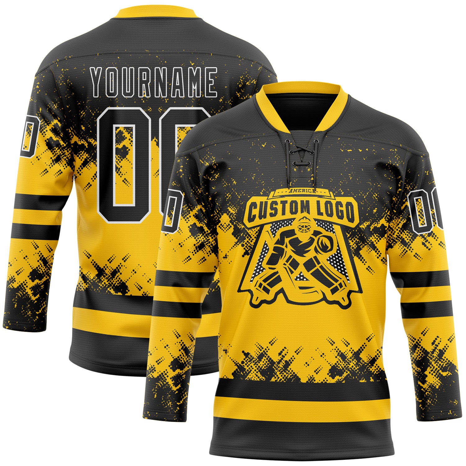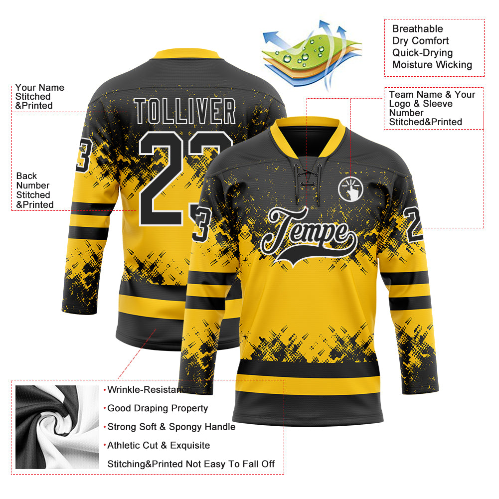 Custom Black Yellow-White 3D Pattern Abstract Splatter Paint Hockey Lace Neck Jersey