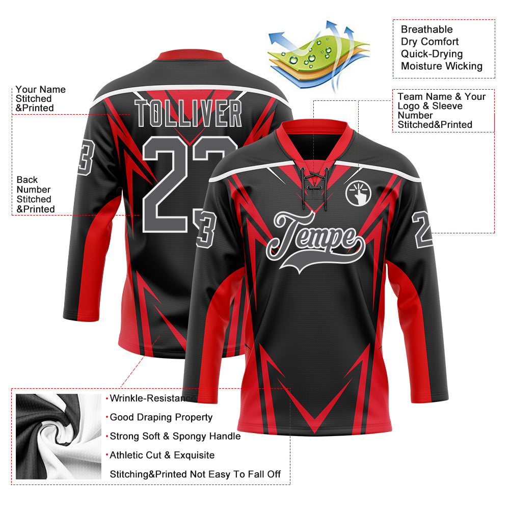 Custom Black Steel Gray Red-White 3D Abstract Pattern Graphic Cyber Mecha E-sport Hockey Lace Neck Jersey