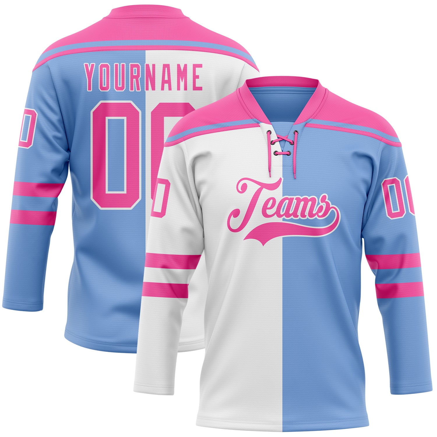 Custom Powder Blue Pink-White Split Fashion Hockey Lace Neck Jersey