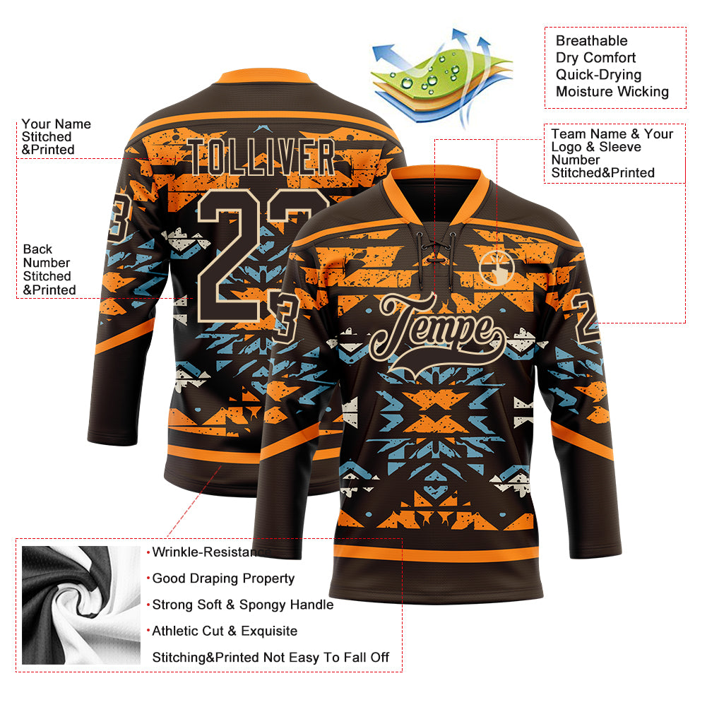 Custom Brown Bay Orange Blue-City Cream 3D Pattern Tribal Indigenous Grunge Splash Hockey Lace Neck Jersey