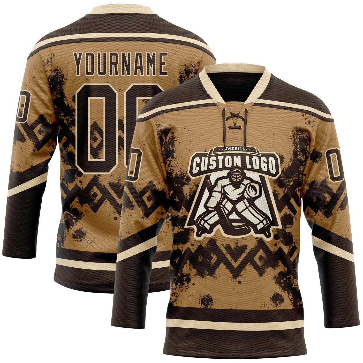 Custom Old Gold Brown-City Cream 3D Pattern Tribal Indigenous Grunge Geometric Splash Hockey Lace Neck Jersey