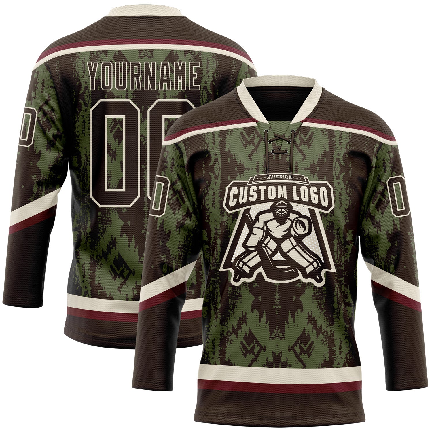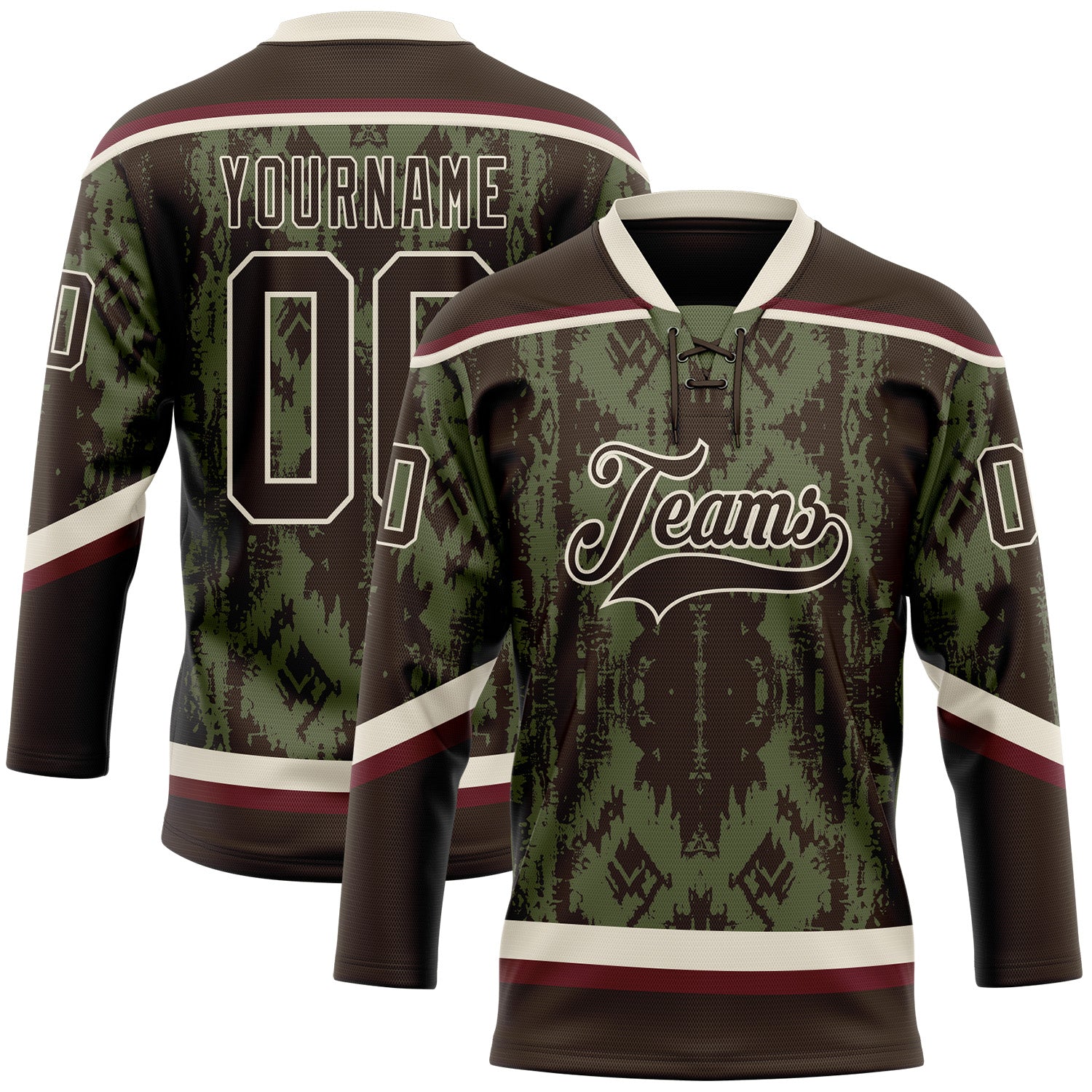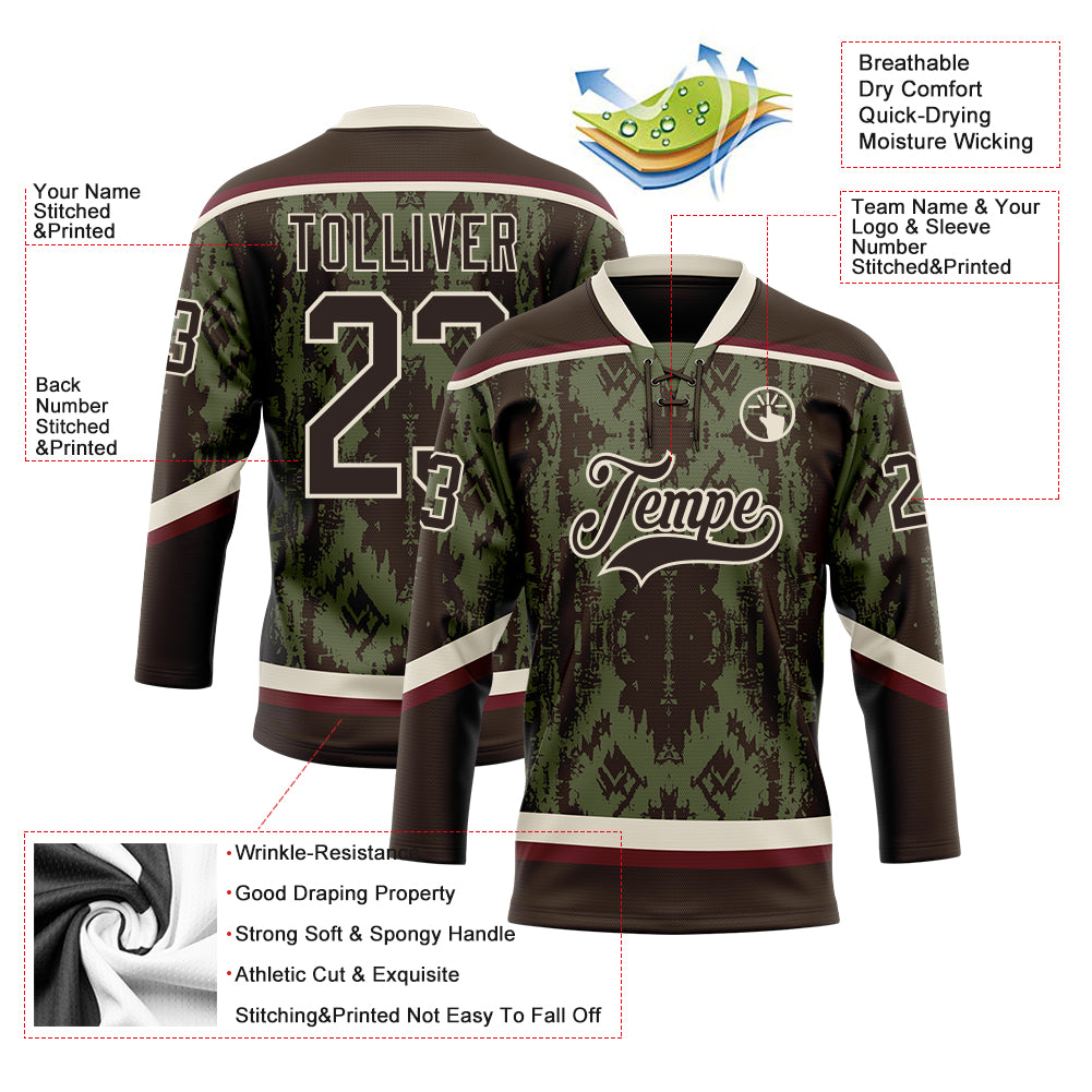 Custom Olive Brown Cream-Burgundy 3D Pattern Tribal Indigenous Grunge Splash Hockey Lace Neck Jersey
