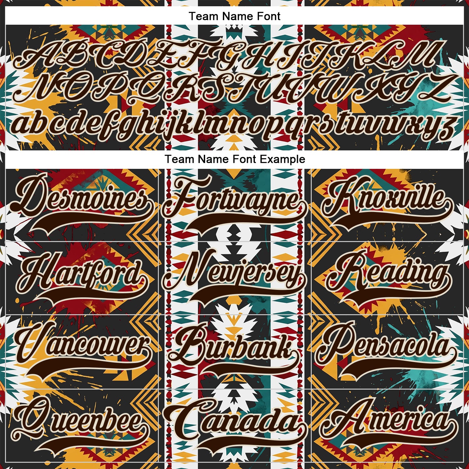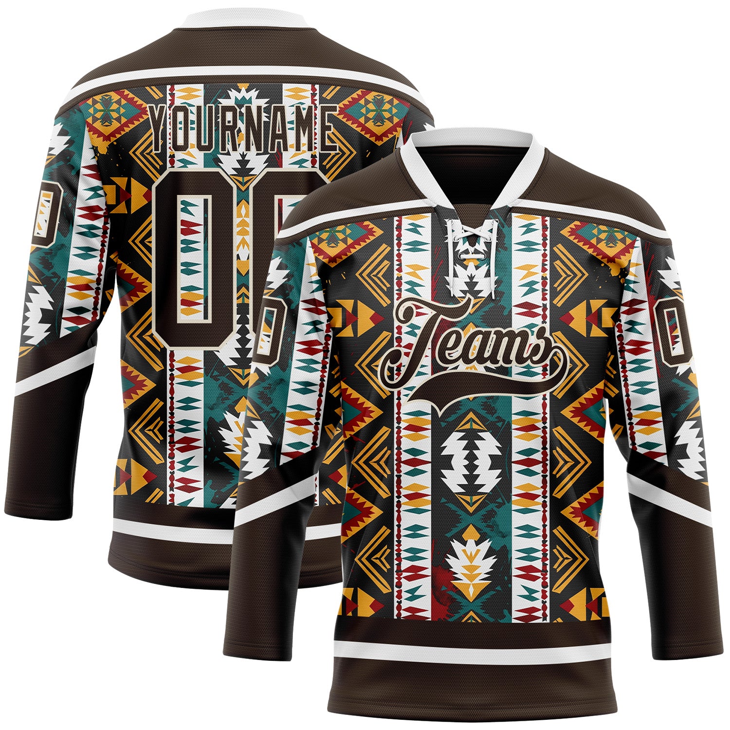 Custom Brown Yellow Green Red-Cream 3D Pattern Tribal Indigenous Grunge Geometric Splash Hockey Lace Neck Jersey