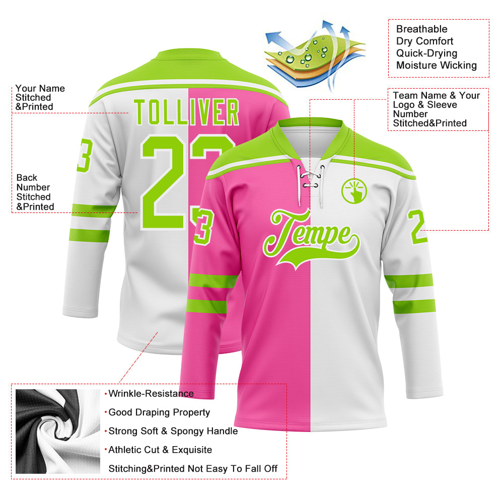 Custom White Neon Green-Pink Split Fashion Hockey Lace Neck Jersey