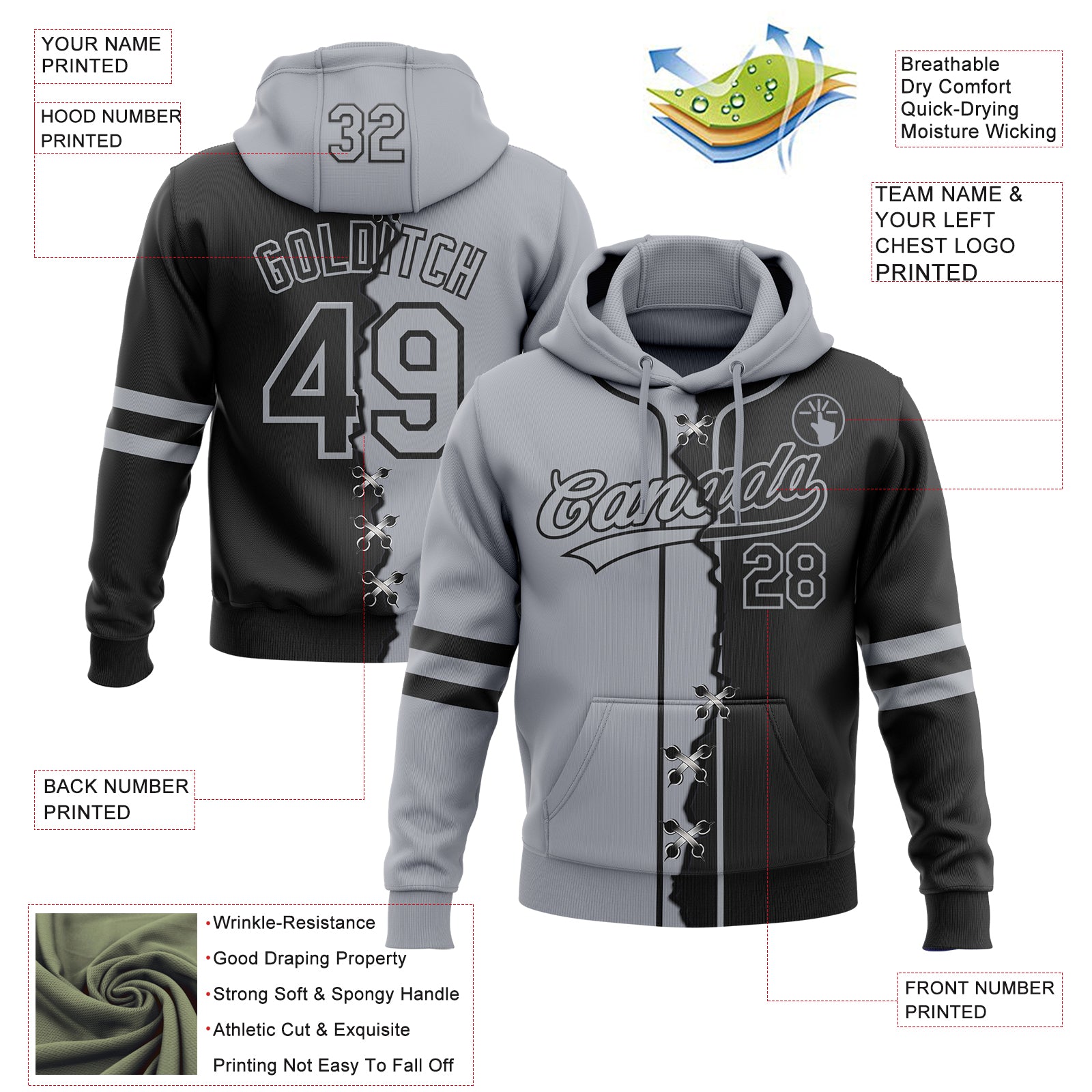 Custom Black Gray Split Ripped Pattern Baseball Pullover Sweatshirt Hoodie