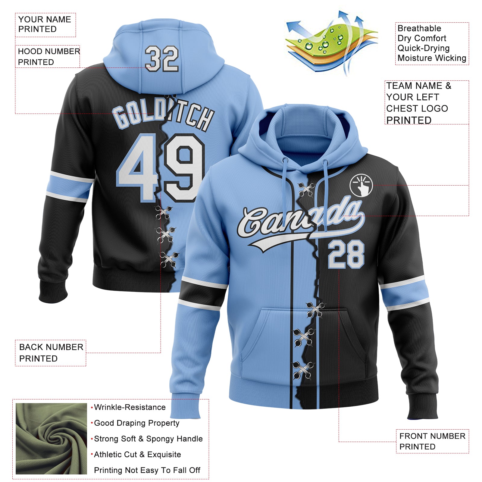 Custom Black White-Light Blue Split Ripped Pattern Baseball Pullover Sweatshirt Hoodie